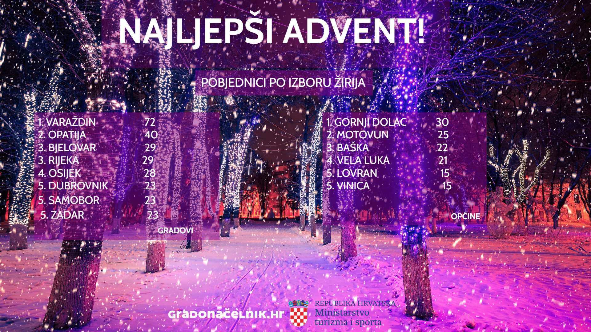 Nakon Gornjeg Doca, najviše glasova žirija među općinskim adventima osvojio je Advent u Motovunu, treće mjesto zauzela je Baška, a Top 5 najljepših zaključuju adventi u Vinicama i Lovranu.