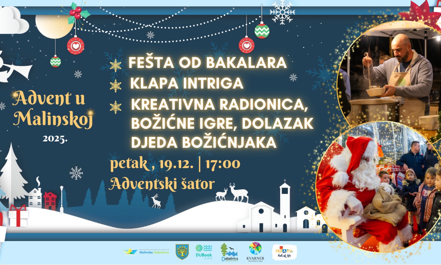 Adventski šator ovog će petka, 19. prosinca od 17 sati ugostiti Feštu od bakalara donosi pravi blagdanski ugođaj uz program za sve generacije. U 17:00 sati najmlađe očekuje veseli animacijski program s Andreom Tavčar, uz igre i kreativne aktivnosti. U 18:00 sati stiže Djed Božićnjak, započinje podjela jela od bakalara, a oko 18:30 sati atmosferu dodatno zagrijava klapa Intriga.