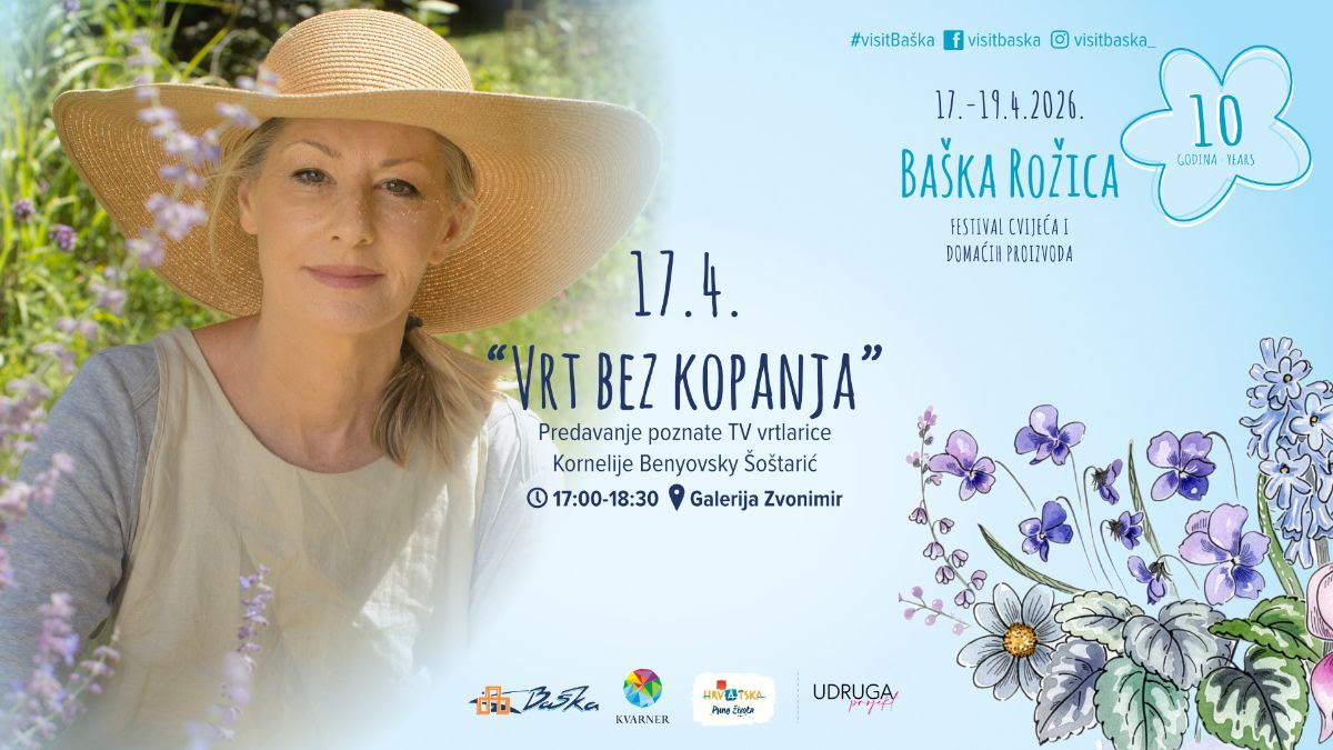 Za sve zaljubljenike u vrtlarenje, popodne donosi i posebno inspirativno predavanje Kornelije Benyovsky Šoštarić “Vrt bez kopanja”, koje će se održati od 17:00 do 18:30 sati u Galeriji Zvonimir. Riječ je o sve popularnijem pristupu vrtlarstvu koji naglašava očuvanje strukture tla, smanjenje fizičkog rada i održivi odnos prema prirodi. Kroz svoje bogato iskustvo u organskom vrtlarstvu i oblikovanju pejzaža, Kornelija će približiti ovu metodu svima koji žele vrtlariti jednostavnije i u skladu s prirodnim procesima. Predavanje je besplatno, a broj mjesta je ograničen.