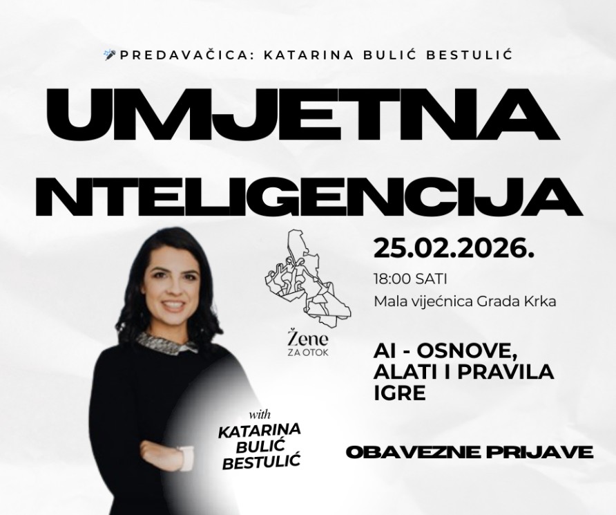Drugo predavanje zakazano je za 25. veljače u 18 sati, također u Maloj vijećnici, a bavi se temom koja snažno oblikuje suvremeni svijet – umjetnom inteligencijom. Predavanje „Umjetna inteligencija — osnove, alati i pravila igre“ održat će Katarina Bulić Bestulić, međunarodno priznata stručnjakinja za AI governance, koja savjetuje tvrtke i institucije te predaje na konferencijama u New Yorku, Londonu i Bruxellesu. Riječ je o znanju koje se u poslovnom okruženju najčešće prenosi kroz skupe edukacije i konzultantske programe, a u Krku će biti predstavljeno na razumljiv i primjenjiv način.