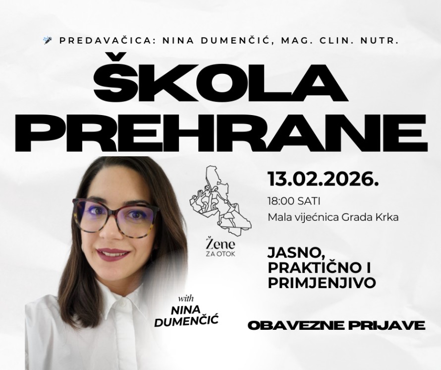 Prvo predavanje održat će se 13. veljače u 18 sati u Maloj vijećnici Grada Krka, pod nazivom „Uloga pravilne prehrane u dugoročnom zdravlju“. Predavanje vodi Nina Dumenčić, magistra kliničkog nutricionizma s devet godina formalnog obrazovanja u području prehrane i zdravlja. Sudionici će imati priliku čuti znanstveno utemeljene, ali jasno i praktično objašnjene odgovore na pitanja zašto dijete često ne uspijevaju, kako treba izgledati nutritivno balansiran obrok te kako održavati stabilnu glikemiju u svakodnevnom životu.