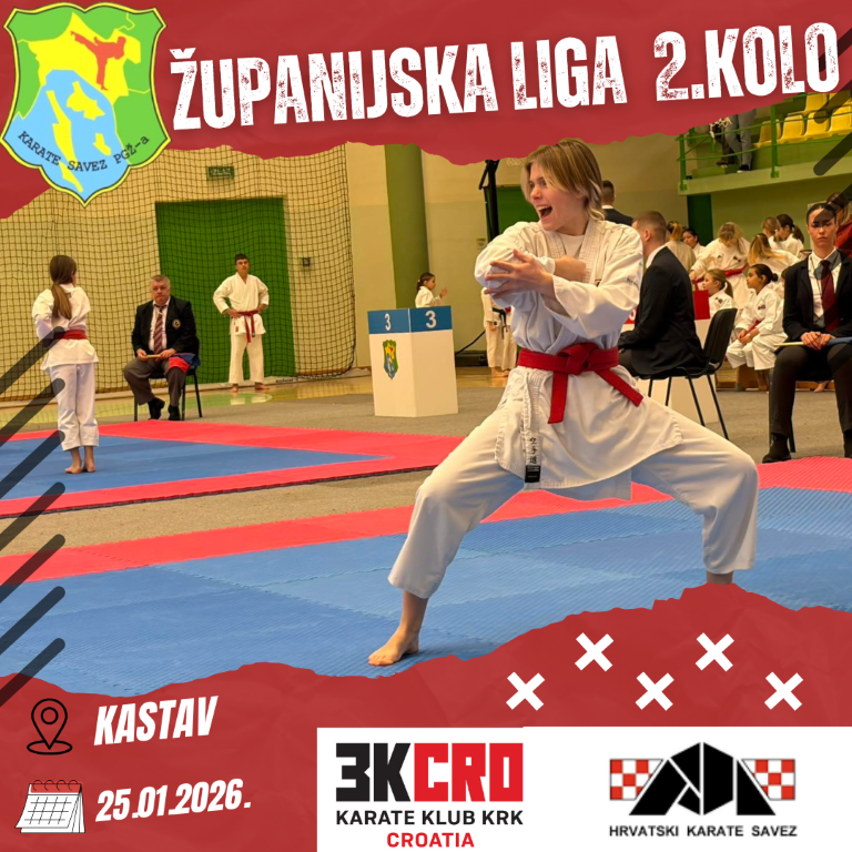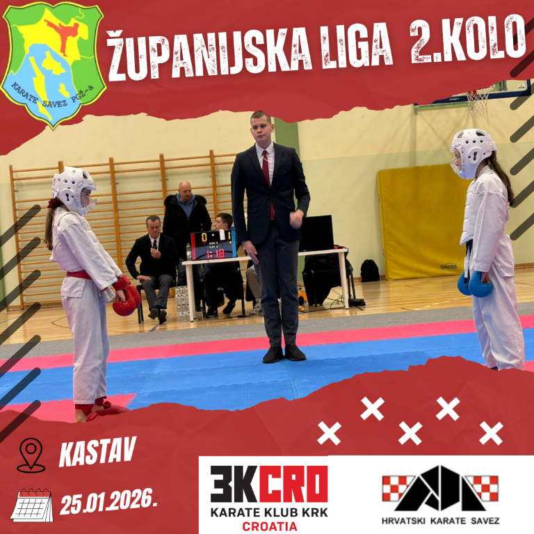 Ovog vikenda, 25. siječnja u Kastvu se održalo drugo kolo Županijske lige u karateu. Karatisti Karate kluba Krk Croatia i ovog su se puta zaputili u skupljanje bodova kako bi se na kraju lige što bolje pozicionirali na ljestvici.