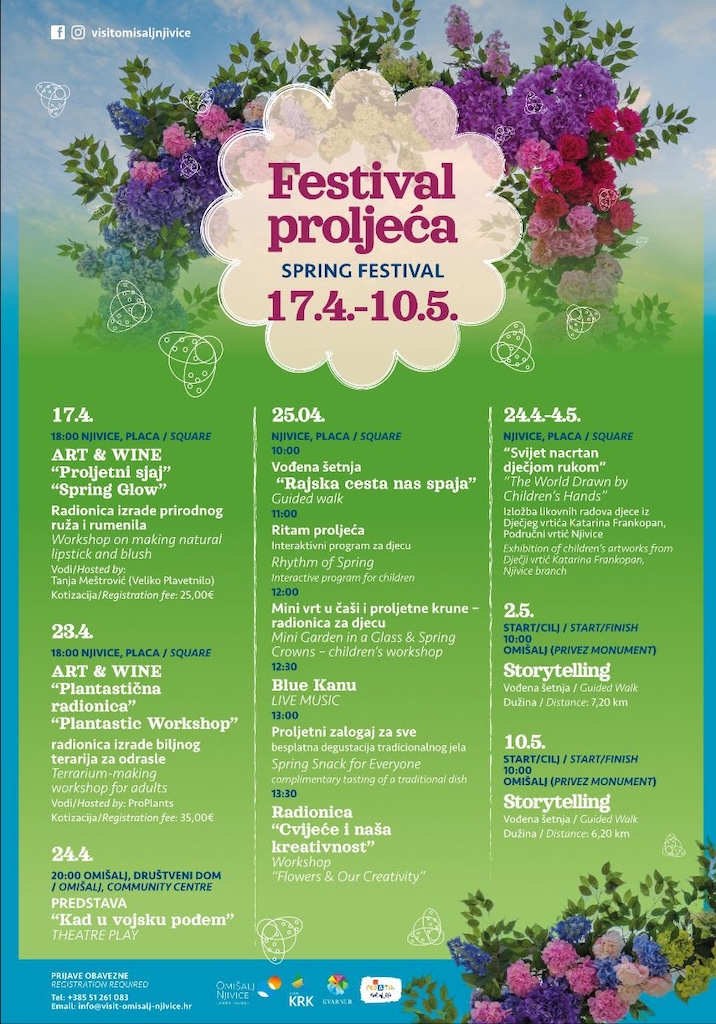 Proljeće u Omišlju i Njivicama donosi raznolik i sadržajan program koji kroz nekoliko tjedana povezuje kreativnost, boravak na otvorenom i druženje. Festival proljeća održava se od 17. travnja do 10. svibnja, a kroz radionice, izložbe, šetnje i događanja nudi priliku da svatko pronađe nešto za sebe.