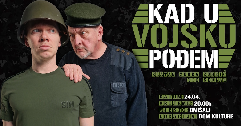 U petak, 24. travnja, u Društvenom domu u Omišlju na rasporedu je kazališna predstava “Kad u vojsku pođem”, u izvedbi Zlatana Zuhrića Zuhre i Tina Sedlara. Ova hit komedija kroz duhovit i prepoznatljiv pristup prati odnos oca i sina, otvarajući pitanje generacijskih razlika, odgoja i očekivanja koja se često sudaraju. Otac, uvjeren da njegov sin nije dovoljno “spreman za život”, odlučuje ga pripremiti na svoj način, oslanjajući se na vlastita iskustva iz vojske – što dovodi do niza komičnih situacija i nesporazuma. Predstava na zabavan način propituje koliko se vremena mijenjaju, a koliko neke stvari ipak ostaju iste.
