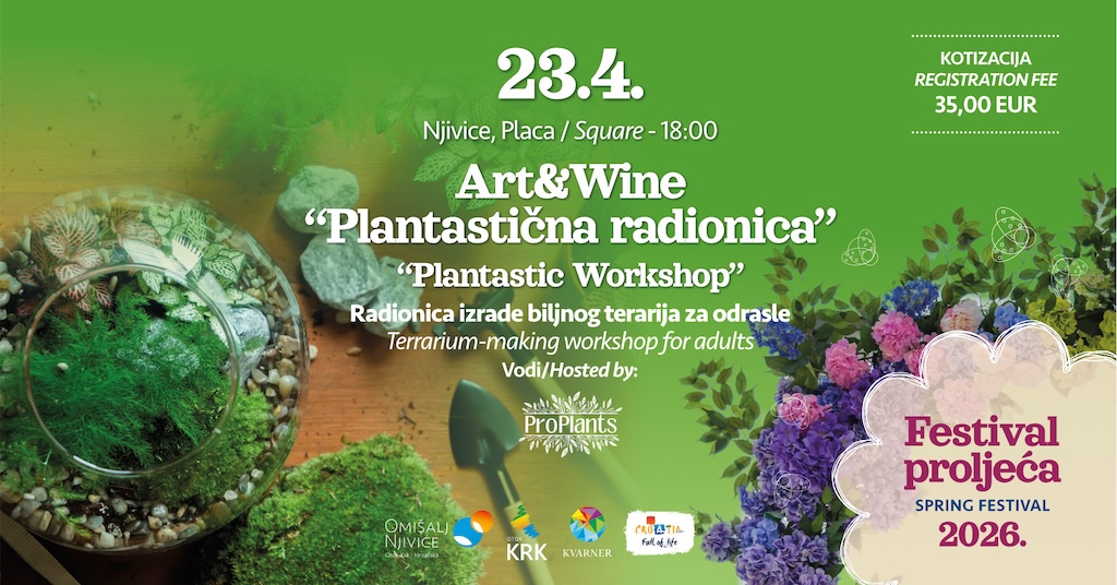 U četvrtak, 23. travnja, slijedi “Plantastična radionica”, također u sklopu Art & Wine programa. Ova radionica fokusira se na izradu biljnog terarija – malog zelenog svijeta u staklu koji sudionici nose kući kao trajni podsjetnik na iskustvo.