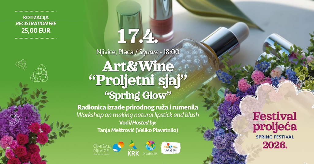 U petak, 17. travnja, program započinje Art & Wine radionicom “Proljetni sjaj” u Njivicama. Riječ je o radionici izrade prirodnog ruža i rumenila pod vodstvom Tanje Meštrović (Veliko Plavetnilo), gdje sudionici kroz praktičan rad upoznaju prirodne sastojke i izrađuju vlastite proizvode.