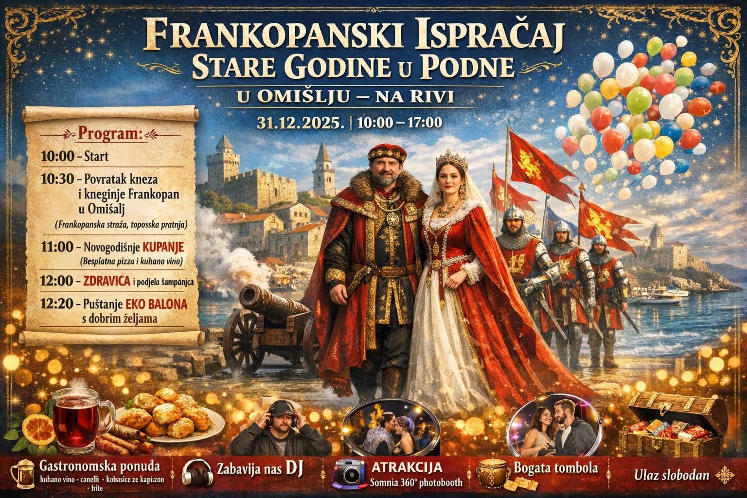 Od 10 do 17 sati na rivi u Omišlju bit će pak u tijeku Frankopanski ispraćaj stare godine. U 10.30 na rivu će stići knez i kneginja Frankopan sa svojom svitom, Frankopanskom stražom kaštela Grobnik, manifestacijski top i trsatske Frankopanke. U 11 sati na redu je i novogodišnje kupanje hrabrih gostiju i Omišljanskih kormorana uz najavu topom. Sve plivače čeka besplatna pizza i kuhano vino, a točno u podne nazdravit će se i podjelom vrbničkog pjenušca te puštanjem eko balona dobrih želja. u 12.30 sati na redu je “mali” dimni vatromet.