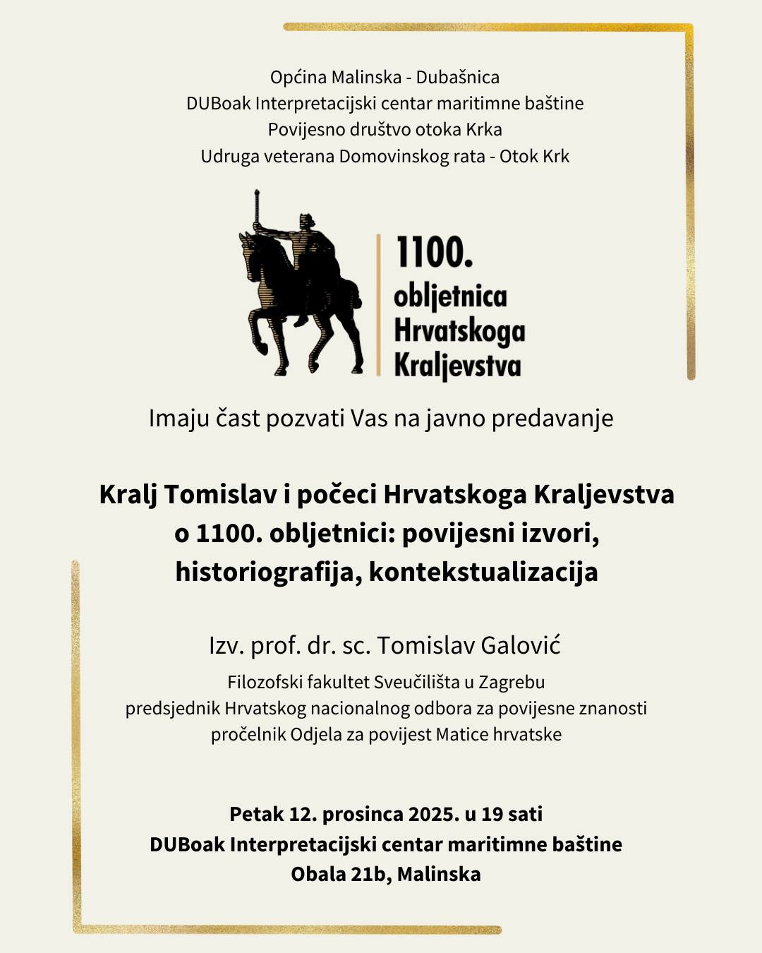 Ovoga petka, 12. prosinca 2025., u Interpretacijskom centru maritimne baštine DUBoak u Malinskoj održat će se javno predavanje “Kralj Tomislav i počeci Hrvatskoga Kraljevstva o 1100. obljetnici: povijesni izvori, istoriografija, kontekstualizacija”.