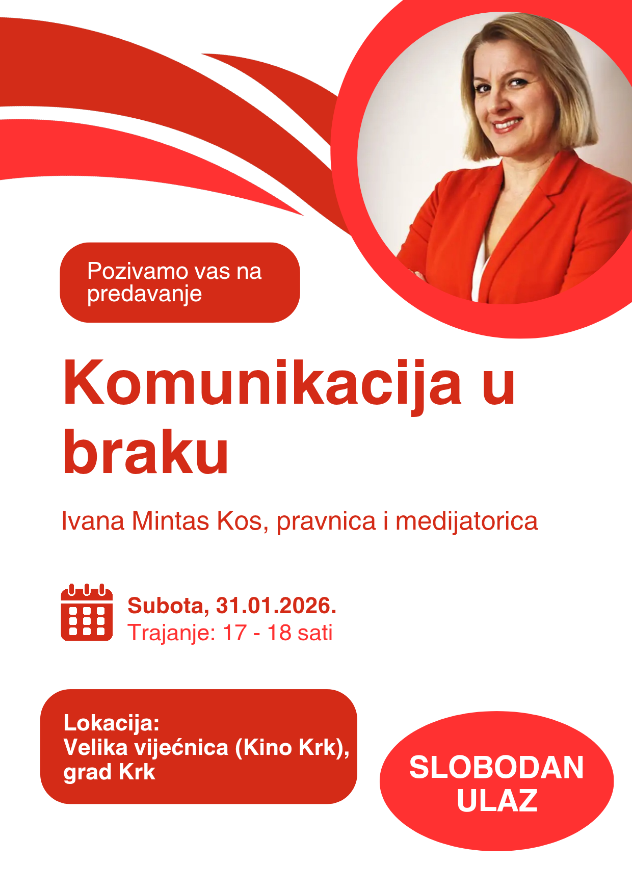 Predavanje vodi Ivana Mintas Kos, pravnica i medijatorica, koja će govoriti o svakodnevnim izazovima bračne komunikacije, nerazumijevanju, sukobima i načinima kako graditi zdraviji odnos kroz bolji dijalog.