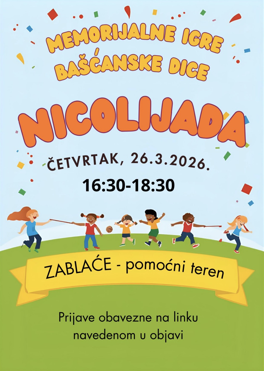 “Dragi roditelji, pozivamo vas i vašu djecu na memorijalne igre bašćanske dice – Nicolijadu u čast Nicol Čačić, koja će se održati na njen rođendan 26.3.2026. na Zablaću s početkom u 16.30.