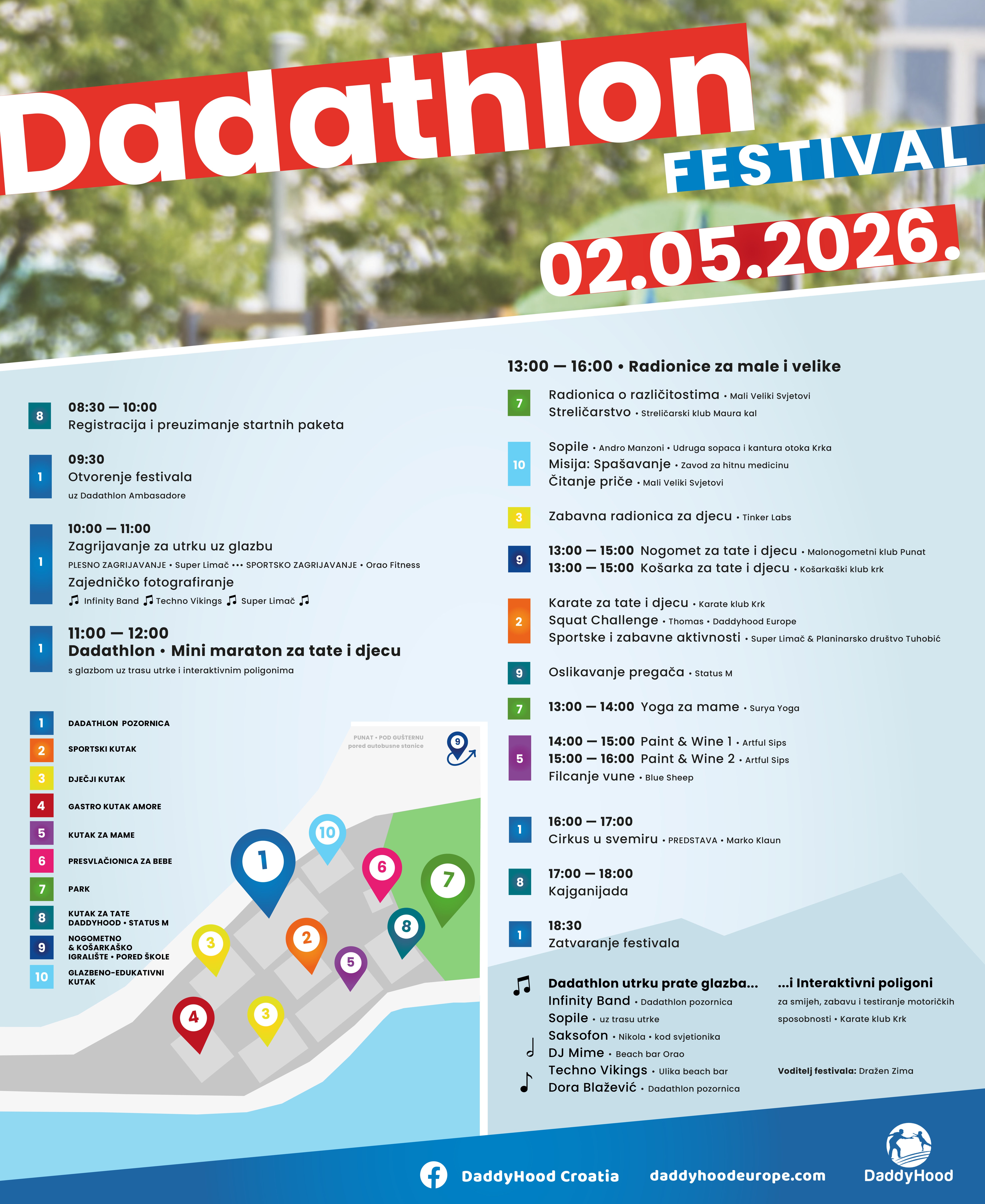 U subotu, 2. svibnja 2026., Punat ponovno otvara svoja vrata za peto jubilarno izdanje Dadathlon festivala. Iako se ovogodišnji festival održava u jednom danu, ispunili smo ga bogatim i raznovrsnim programom kako bismo osigurali nezaboravno iskustvo za svaku obitelj. Dadathlon nije samo utrka, već dan posvećen stvaranju zajedničkih uspomena, aktivnom druženju tata i djece te slavljenju aktivnog očinstva.