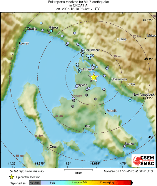 Martina Frka Milotić 20 hours ago NovostiPotres se najjače osjetio na području Omišlja i Dobrinjštine te na kopnu, na području Jadranova, Kraljevice, Crikvenice, Triblja i Šmrike, pa čak i na Kukuljanovu i Drenovi