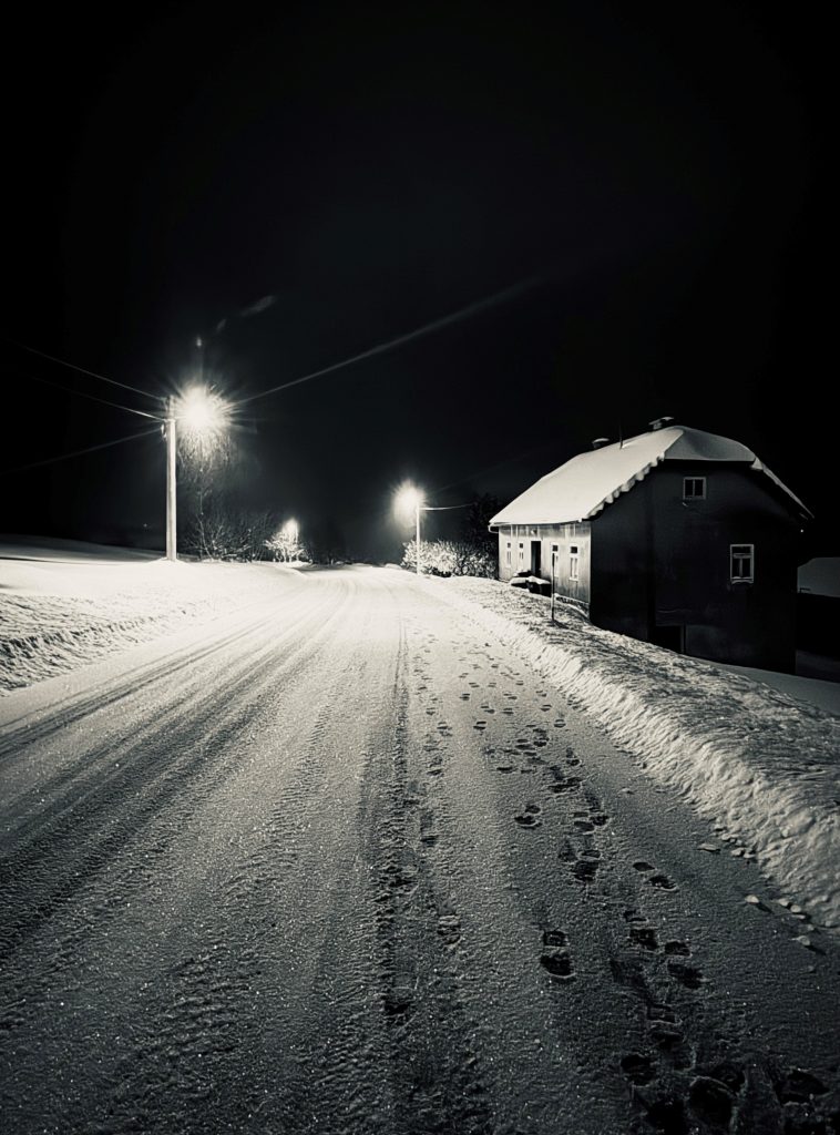 Zajedno, fotografije čine cjelinu koja poziva na promišljanje, tiho promatranje i ponovno otkrivanje ljepote u jednostavnosti. Siječanjski natječaj tako postaje vizualni prostor susreta hladnoće i topline, samoće i povezanosti, tišine i dubokog unutarnjeg doživljaja. Na prvo mjesto nominiram fotografiju Tragovi tišine Nataše Vučinić. Ova fotografija prikazuje noćni zimski prizor uronjen u duboku tišinu i smirenost. Snijegom prekrivena cesta proteže se u daljinu, blago zakrivljena, kao put koji vodi izvan kadra i vremena. Površina snijega je netaknuta osim tragova stopala s desne strane – suptilan, ali snažan znak ljudske prisutnosti koji naglašava osjećaj samoće. Ulične svjetiljke raspršuju hladno svjetlo po snježnom krajoliku, stvarajući oštre kontraste između tame noći i bijele površine tla. Svjetlo ne djeluje agresivno; ono tiho obasjava prostor, kao da čuva put i kuću uz cestu. Ta kuća, s krovom prekrivenim snijegom i zatvorenim prozorima, odiše toplinom unatoč hladnoći, ali nenametljiva, gotovo povučena u vlastitu tišinu. Crno nebo bez zvijezda dodatno pojačava osjećaj izolacije i introspekcije, dok linearna perspektiva ceste vodi pogled promatrača prema nepoznatom, potičući razmišljanje i unutarnji dijalog. Fotografija ne nudi dramatičan događaj, već trenutak zaustavljenog vremena, prizor u kojem se zimska hladnoća susreće s osjećajem sigurnosti, a tišina postaje glavni nositelj emocije.