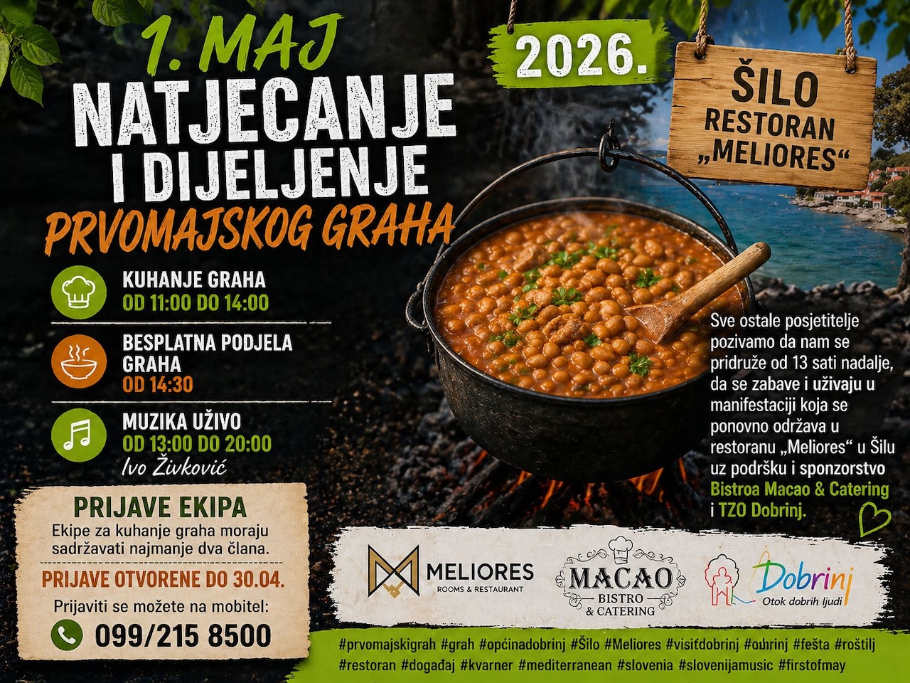 01.05. u Šilu u restoranu Meliores održava se natjecanje i dijeljenje prvomajskog graha 2026. Natjecatelji počinju s kuhanjem graha u 11:00 sati, a kuhanje traje do 14:00 sati. Nakon toga slijedi besplatna podjela graha s početkom u 14:30 sati. Muzika počinje u 13:00 h i traje do 20:00 h.