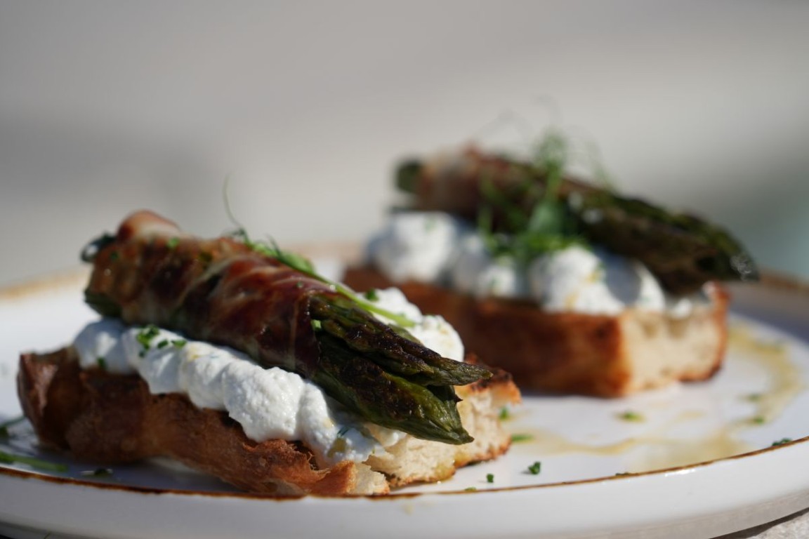 - Brusketa s kremom od skute, pancetom i šparogama