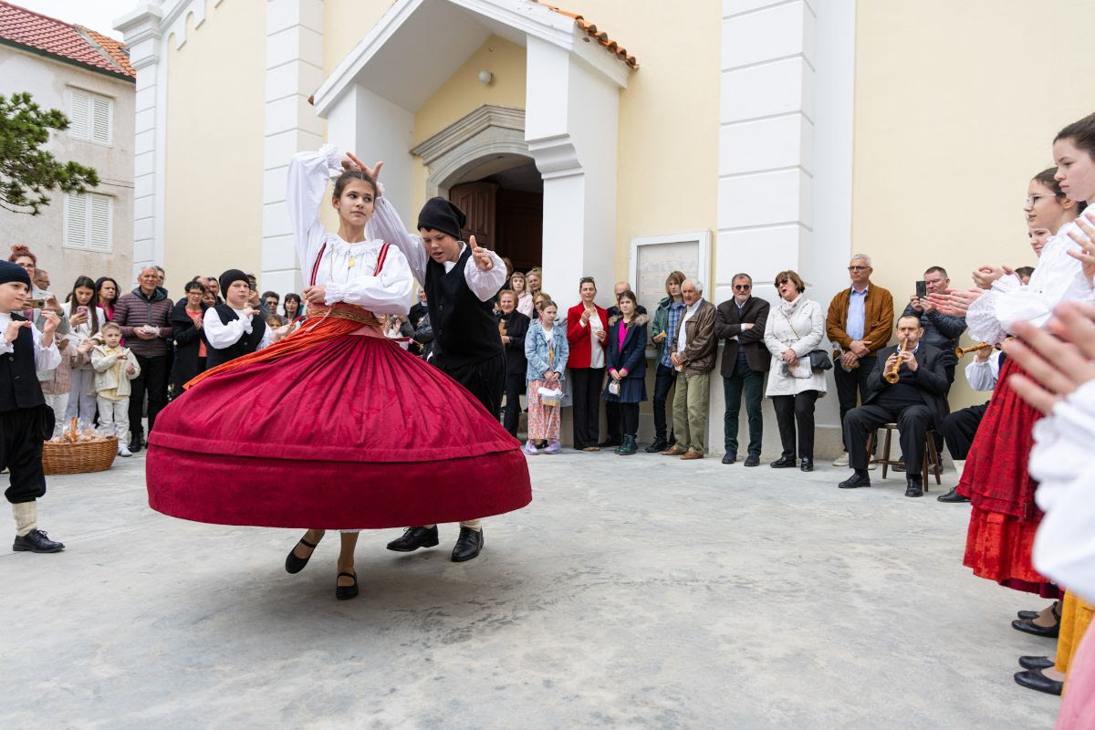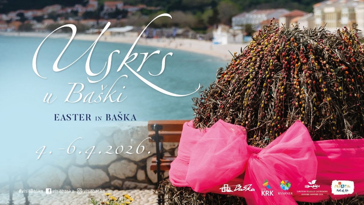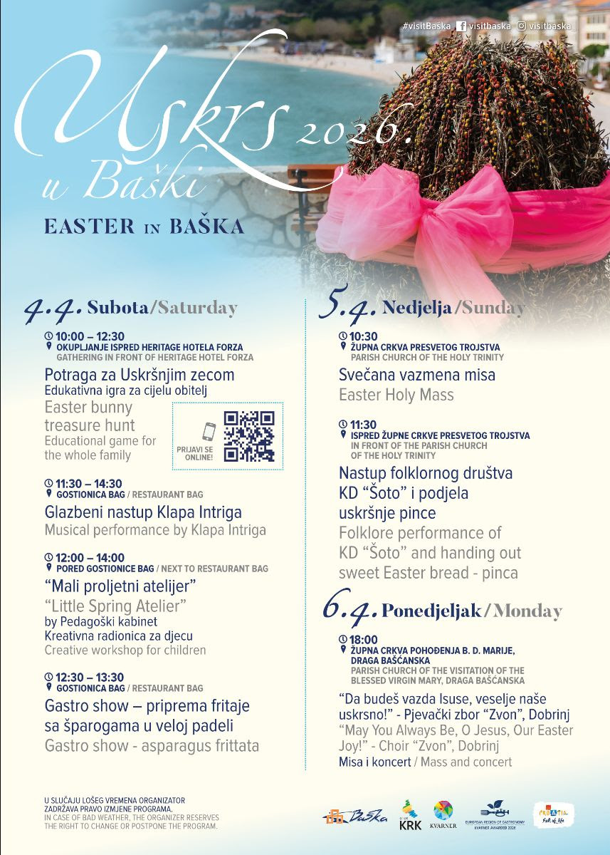 Uskrsna nedjelja, 5. travnja, donosi mirniji, svečaniji ton. Dan započinje svetom misom u 10:30 sati u župnoj crkvi Presvetog Trojstva, prostoru koji svojom poviješću i ugođajem pruža poseban okvir za proslavu Uskrsa. Nakon mise, ispred crkve slijedi nastup mlađe skupine folklornog društva KD “Šoto”, koji će tradicionalnim plesovima unijeti živost i radost u blagdansko jutro. U tom ozračju zajedništva, posjetiteljima će biti podijeljena uskrsna pinca – simbol topline doma, gostoprimstva i dobrih želja koje se prenose generacijama – kao dar Turističke zajednice općine Baška.