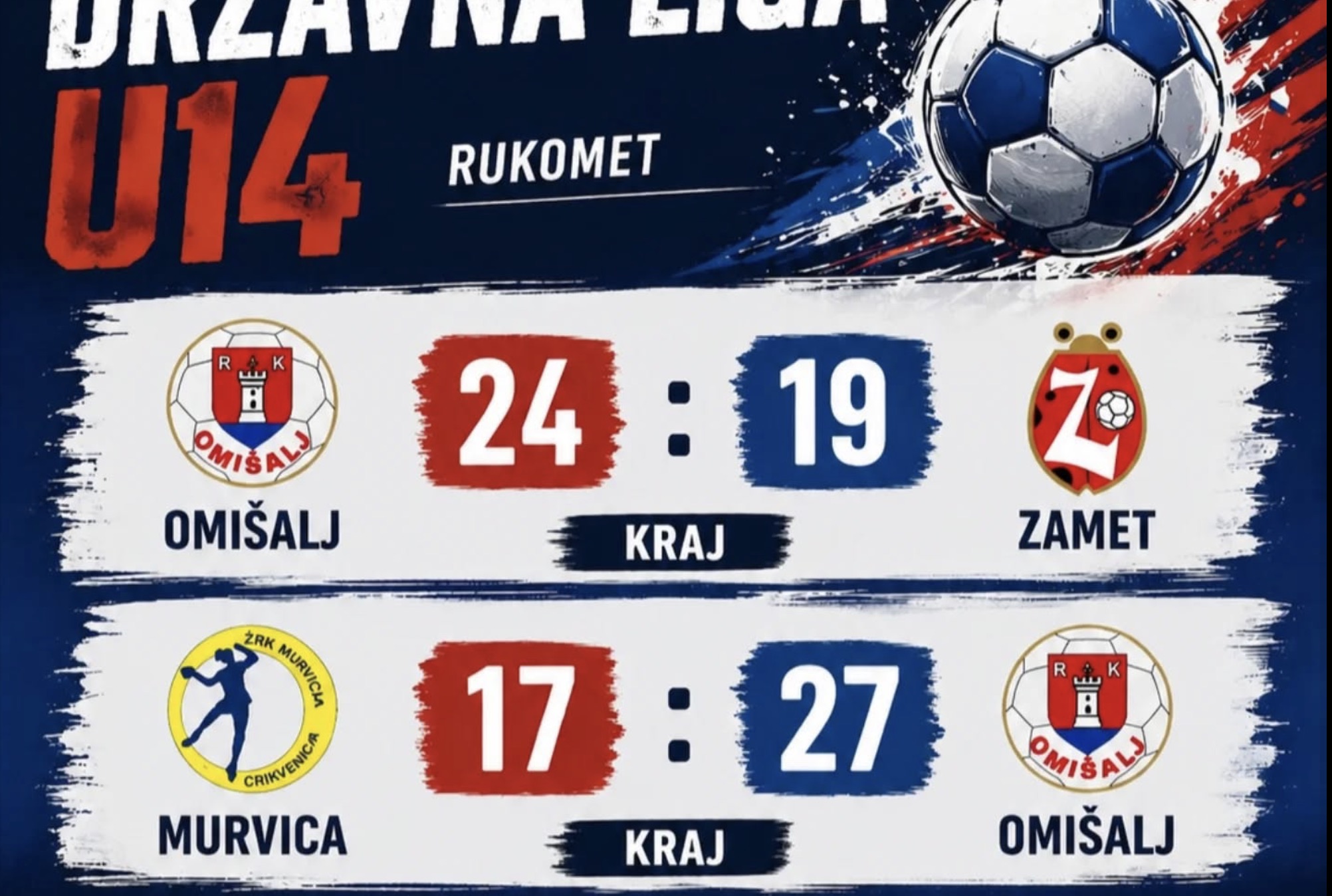 U14 ekipa slavila je u dvorani u Malinskoj protiv Murvice sa 27:17, a nad zamętom 24:19 te tako upisale nova 4 bodą. Unatoč ranijim propuštenim bodovima protiv Rudara i Raba, ove bitne pobjede smjestile su našu ekipu na odlično 3. mjesto ljestvice.