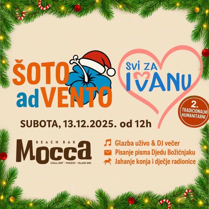 “U subotu 13.12. pušćajte si libero dan aš opet spravljamo humanitarni ŠotoAdvento! Počet ćemo na podne kad švagne zvono na crikvu Svete Fuske pa sve dokle nas friškeca navečer pušća (a lani ste bili fanj potrpljivi). Kol ure za podne počinje živa muzika, a malo kašnje Dj Jole. Za dičinu i ovo leto će bit konji, deda mraz zi punu vriću bunboni, vođene kreativne radionice za dicu, facepainting… Bit će i mali štandić za kupit božićni ukrasi ča su dica sama činila. Mesto za se kušnut i slikat.
