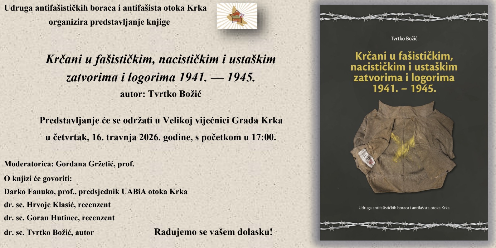 Dan ranije, u četvrtak 16. travnja godine u 17:00 sati, u Velikoj vijećnici Grada Krka održat će se predstavljanje knjige “Krčani u fašističkim, nacističkim i ustaškim zatvorima i logorima 1941. — 1945.” autora Tvrtka Božića.