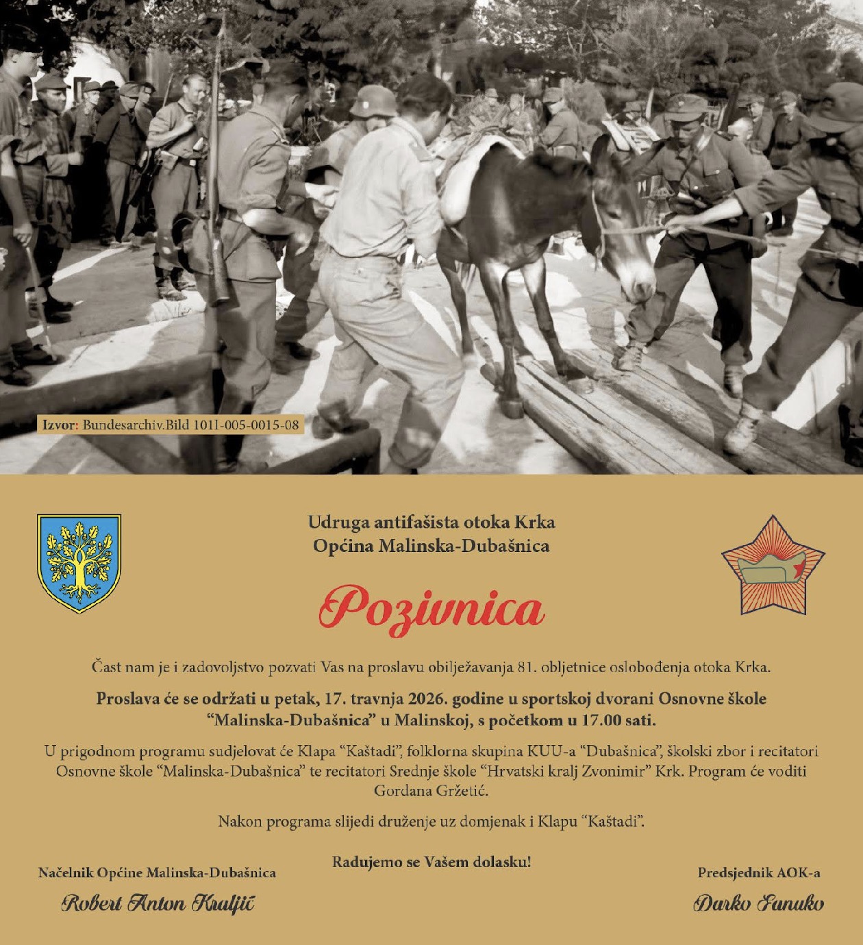 U petak 17. travnja, u u sportskoj dvorani Osnovne škole “Malinska-Dubašnica” u Malinskoj održat će se proslava obilježavanja 81. obljetnice oslobođenja otoka Krka.