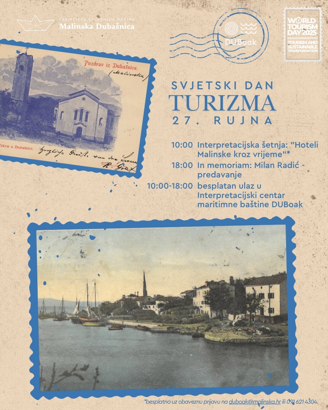 Martina Frka Milotić 5 days ago Turizam & gastroPovodom Svjetskog dana turizma koji će se održati u subotu, 27.rujna 2025., sve zainteresirane očekuje poseban program posvećen bogatoj turističkoj prošlosti Malinske.