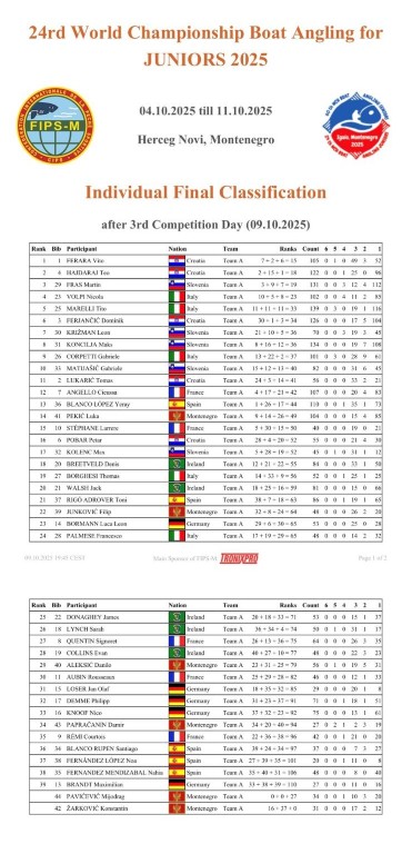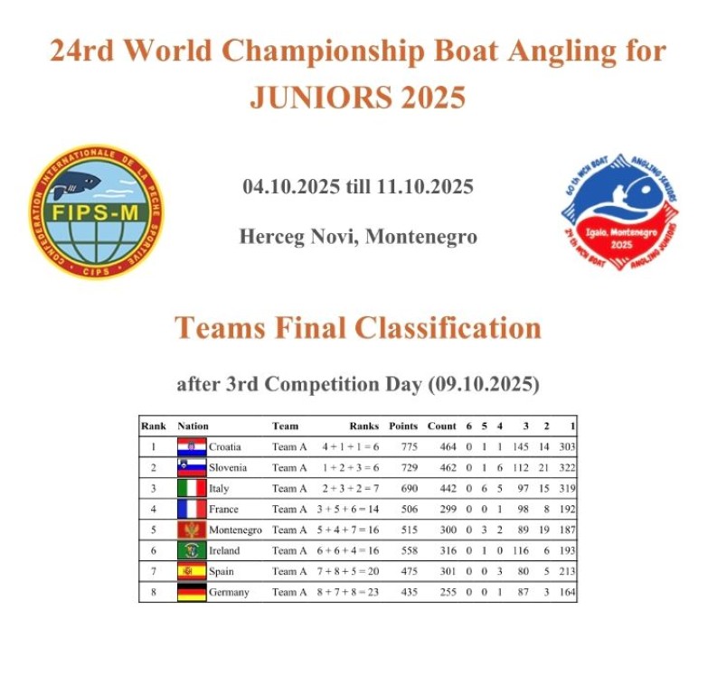 Posljednjeg dana natjecanja mlada reprezentacija Hrvatske bila je jednako dobra ko i drugog dana te se sa šest bodova (kao i Slovenija, ali s više ulovljenih riba) zasluženo okitila zlatnom medaljom. Hrvatski juniori pokazali su snagu i u pojedinačnim nastupima – Vito Ferara iz Tribunja postao je svjetski prvak, a Teo Hajdaraj iz Rijeke viceprvak.
