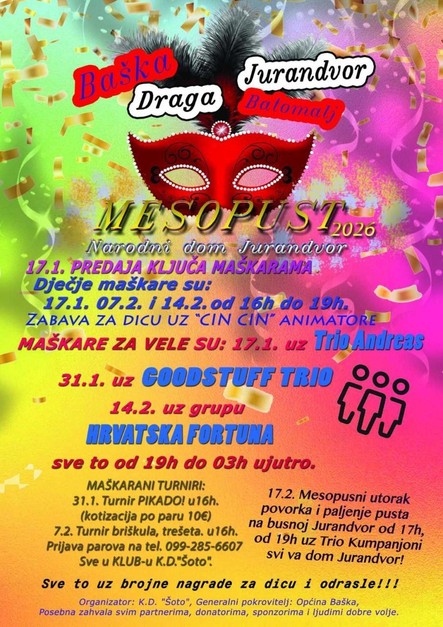 Popodne donosimo šarenu promenadu kroz mjesto – maske, glazbu i onu posebnu energiju koja se osjeti samo na Mesopusni utorek. Navečer slijedi tradicionalno čitanje presude i paljenje mesopusta – simbolični trenutak kojim se opraštamo od maškaranih ludorija. Dođite, povedite obitelj i prijatelje, budite dio običaja koji živi generacijama. Zatvorimo Mesopust 2026. zajedno – uz smijeh, druženje i dobru atmosferu”, poručuju iz TZO Omišalj i Njivice.
